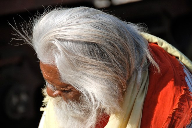 The drive across central India – from a tiger reserve in Bandhavgarh to the ancient city of Khajuraho – was rather dull. After several hours, we came to the town of Satna. Our driver, an Indian native who was intrigued by my camera, suggested that we walk over to the busy railway station to get “good picture.” On the platform, I feasted on the aesthetic elements of the railroad, but a few feet way was an old man wearing bright red and beige robes. He had flyaway silver hair and a marvelous beard, the archetype of a holy man. I scrambled to take his picture, fearing that I had missed the prime shot. Later, I was astonished to see his hair’s richness, his dark wrinkled face, and the bright colors of his clothes.