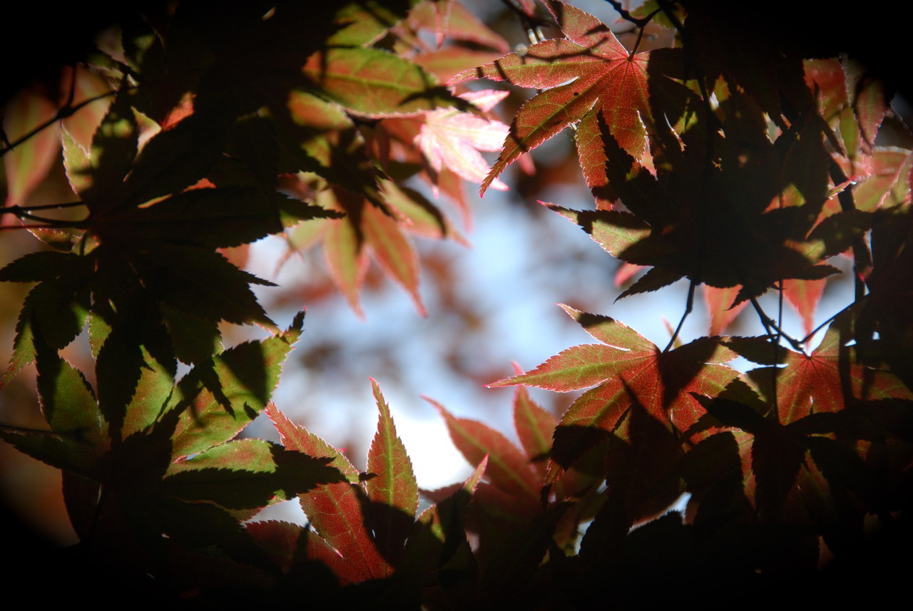 Intertwining Japanese maple branches create a natural window through which to look at the sky. My goal was to create layers of leaves by using shadows and high focus around the edges of the window.